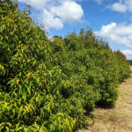 一列に並んだレモンマートルの木。まるで生け垣のように、木の間に隙間なく、つながっているように植栽されています。 ハーベストでは列の両方向からそれぞれ斜めに刈り取られるため、列の断面を見ると、三角形のおにぎりのような形にな …